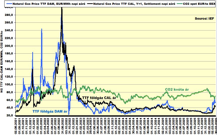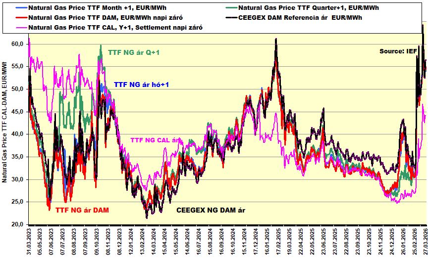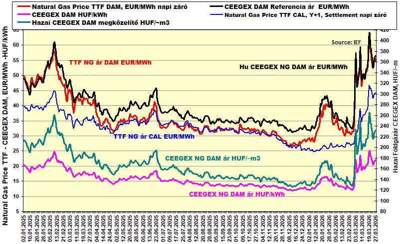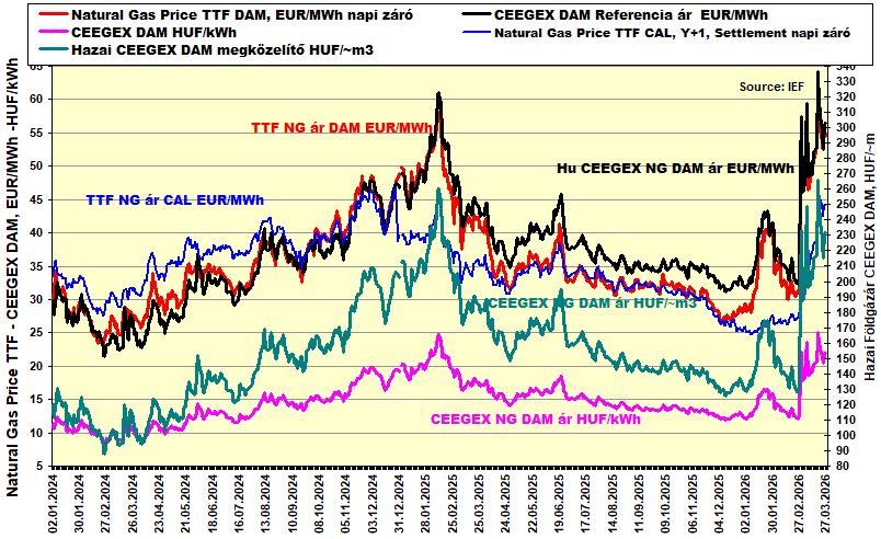 A fenti ábra kiegészül a hazai tőzsdei ár aktuális forint árfolyamával korrigált és egy átlagos országos földgáz összetételére vetített forint/köbméter árral (az adott ár megközelítő jellegű az eltérő földgáz összetétel miatt – igaz az eltérés a szabványos nagynyomású vezetékes gáznál kisebb mint +/- 1 %).