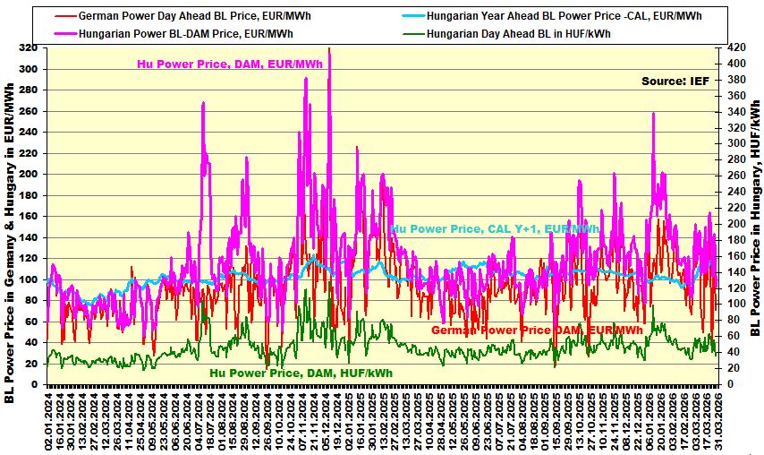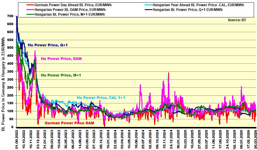Az alábbi ábra a villamos energia rövid-, közép- és éves termékárait mutatja hazánkban és a német tőzsdén (EEX -DAM -következő napi). Ezek az árak segíthetik a rövidtávú 1-3 havi és a negyedéves beszerzési árak megítélését a hazai fogyasztóknak.