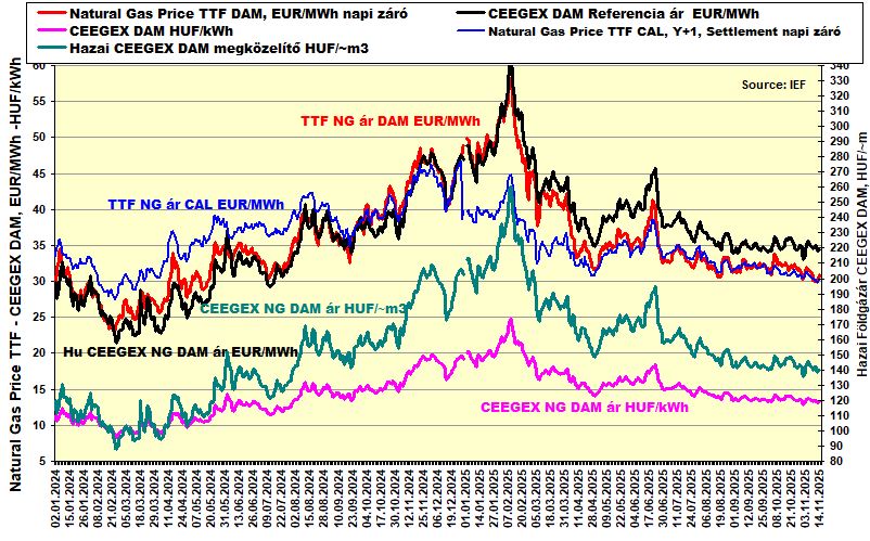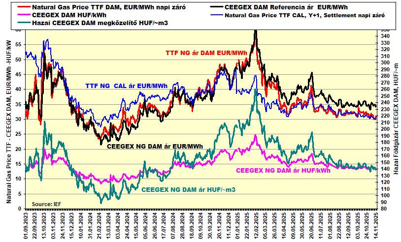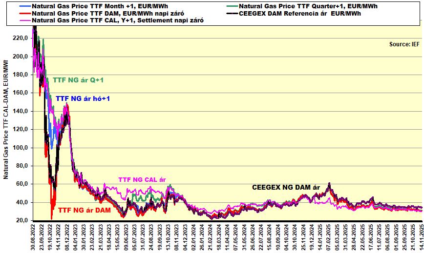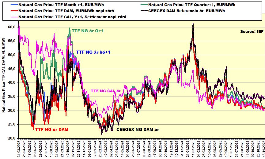 Az előző ábra kiegészítése egy szűkebb időintervallumban, valamint kibővítése a jelenlegi beszerzési stratégiák kialakításában fontosabb rövidtávú (havi és negyedéves) TTF árakkall és a hazai földgáztőzsde (CEEGEX) következő napi áraival.. Az ábrán jól megfigyelhető az árak közeledése – egybe olvadása – a különböző idő intervallumokra, ami a piac „megnyugvását” vetíti előre.