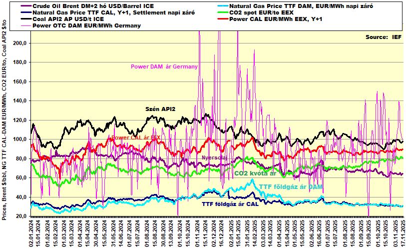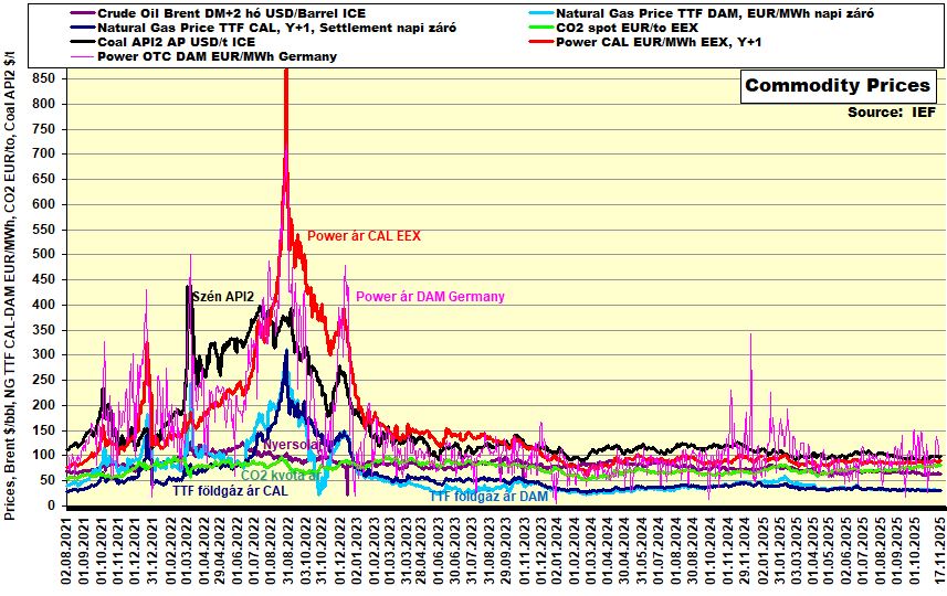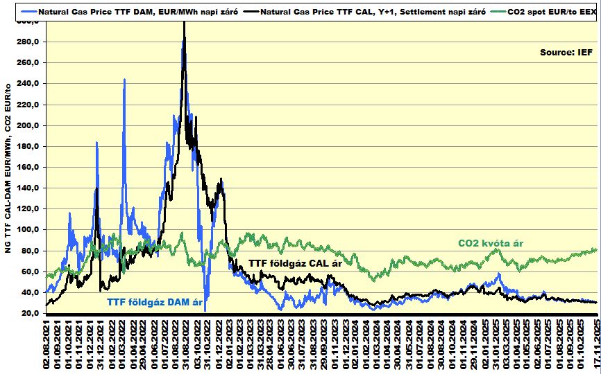 Európában leggyakrabban használt holland tőzsdei (TTF) árak és a CO2 kvótaárak a német tőzsdén (EEX) EUR/MWh-ban