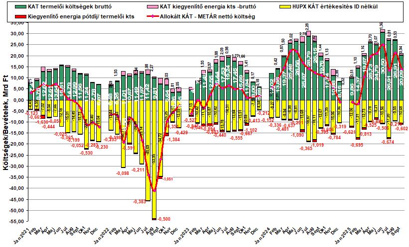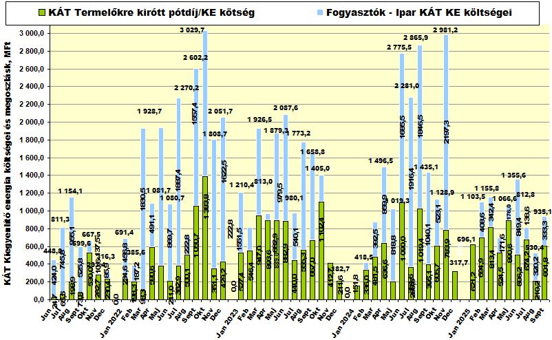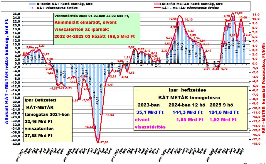 Összességében elmondható, hogy az iparra megújuló támogatásként 2024-ben 144,3 milliárd forint terhet, és 2025 első nyolc honapjában már 110,8 milliárd forintot számláztak ki a KÁT-METÁR mérlegkör támogatása címén, ami a megújuló termelőkhöz ezen, kiváltságos csoportjához vándorolt (ilyen terhek mellett nehéz lesz elvárni az ipartól a szerkezetátalakítást, az energiahatékonyság érdemi javítását és a nemzetgazdaságunk jövedelmezőségi viszonyainak javítását).