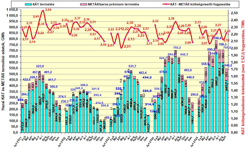 Az alábbi ábra az elmúlt 5 év KÁT és a METÁR havi termelési adatait és a fizetésre kötelezettek (elsősorban ipar) havi fogyasztási adatainak változását mutatja be ugyan azokban a hónapokban.
